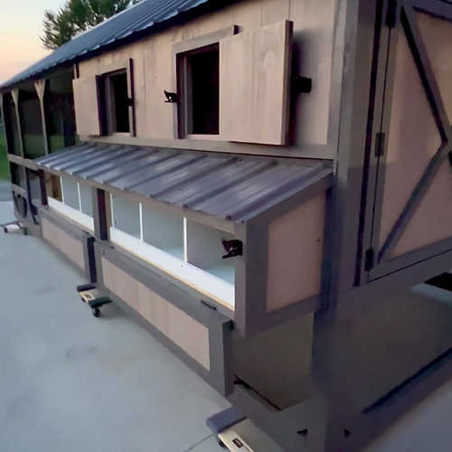 -comes standard with two exterior side nesting boxes(one on each side), two back clean out doors, two chicken entrance doors, two ladders and two man doors.